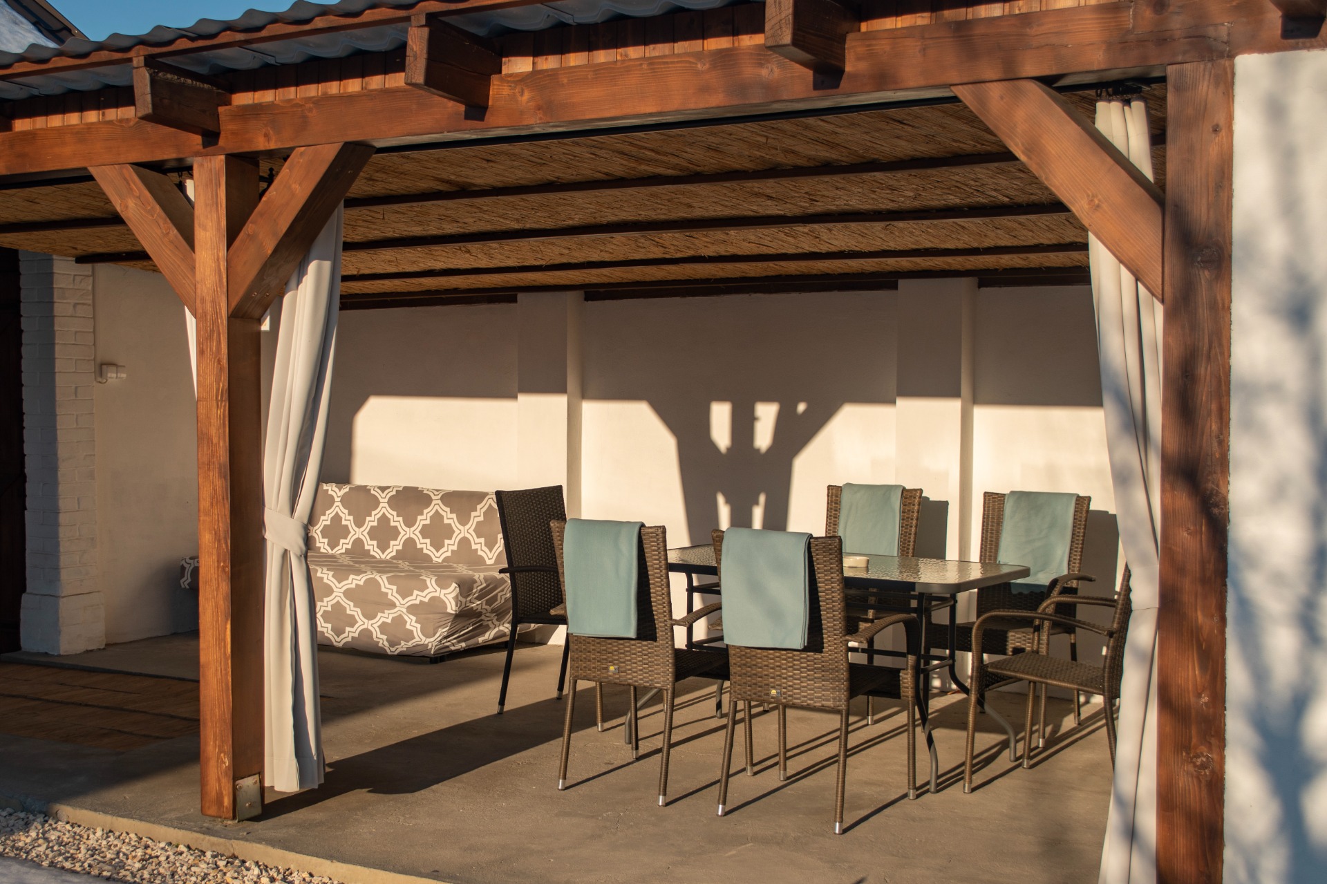 Fedett teraszon elhelyezett kanapé, étkezőasztal székekkel kényelmes helyet biztosít beszélgetésekhez. Szabadtéri sütéshez, főzéshez kerti grill, bogrács, bográcsállvány, szalonnasütő nyársak állnak rendelkezésükre 1-2 sütögetésre elegendő tűzifával és faszénnel.